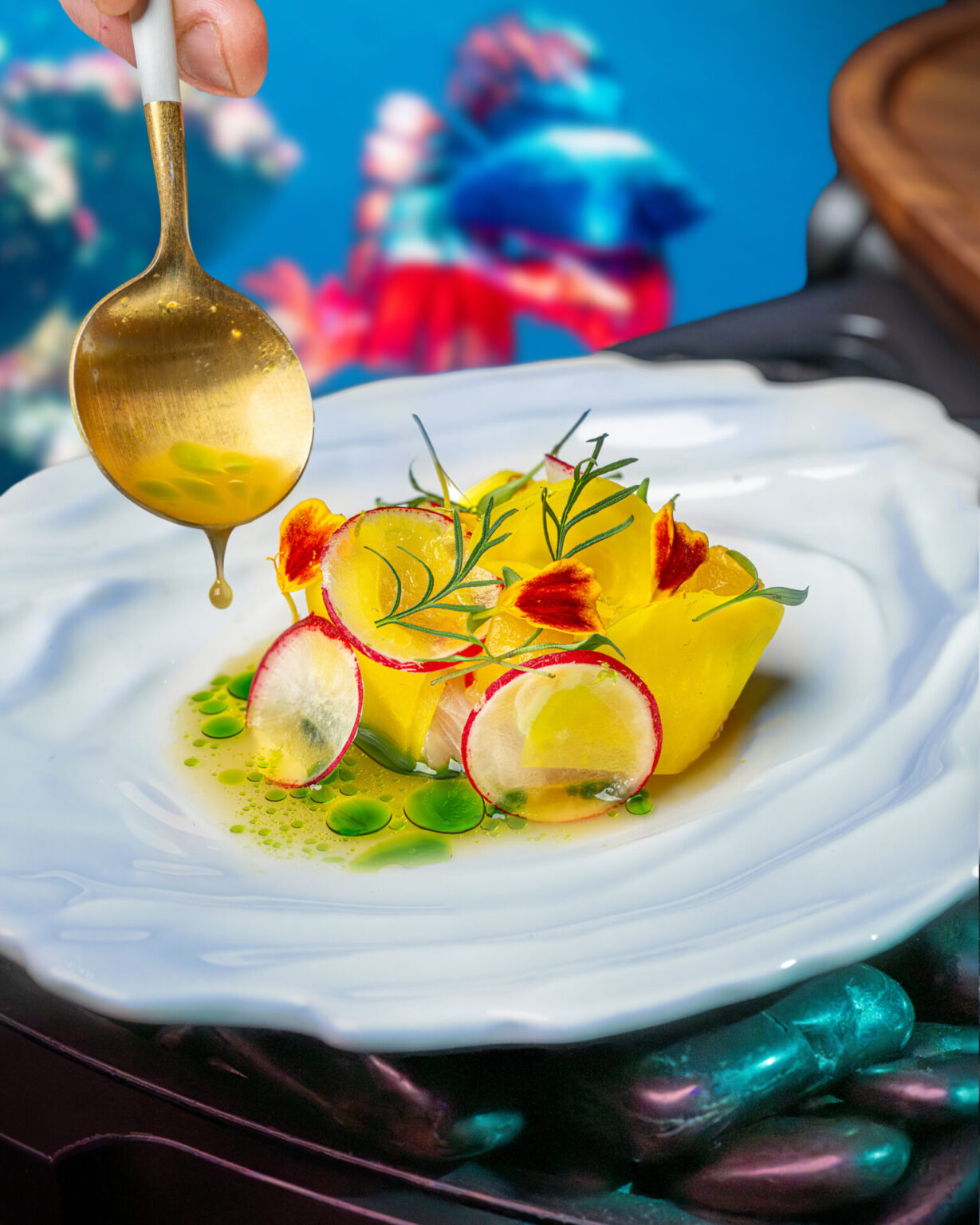 Pour l’univers Ocean d’Eatrenalin, Germann propose une composition pensée autour de hamachi, betterave jaune et camomille – un assemblage où la fraîcheur marine se conjugue avec des notes terreuses et une pointe florale, en parfaite harmonie avec la scénographie immersive du décor. Cette création illustre son sens de l’équilibre entre intensité et délicatesse, entre terroir et inspiration contemporaine, toujours avec une lisibilité gustative nette.