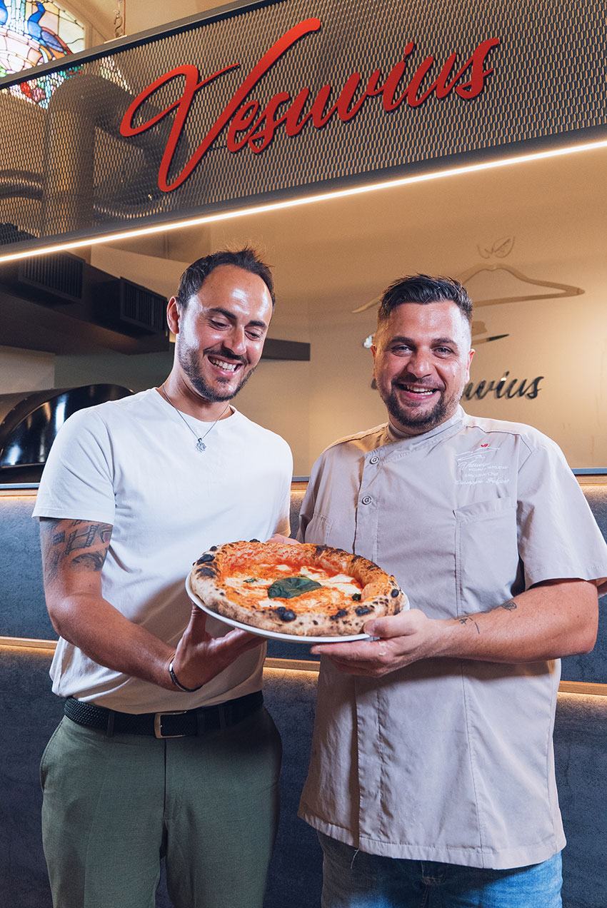 À l’origine de ce projet se trouvent deux personnalités complémentaires. Gianluca Pellegrino, entrepreneur visionnaire, possède une connaissance approfondie de la région ainsi qu’une grande expérience dans le développement de projets ambitieux. Grâce à son sens stratégique et à sa vision, il a su donner forme et identité au concept Vesuvius. À ses côtés, Giuseppe Folgore, talentueux pizzaïolo, incarne l’âme napolitaine du restaurant. Animé par une véritable vocation et doté d’un flair créatif unique, il perpétue l’art de la pizza napolitaine tout en y apportant sa touche personnelle.